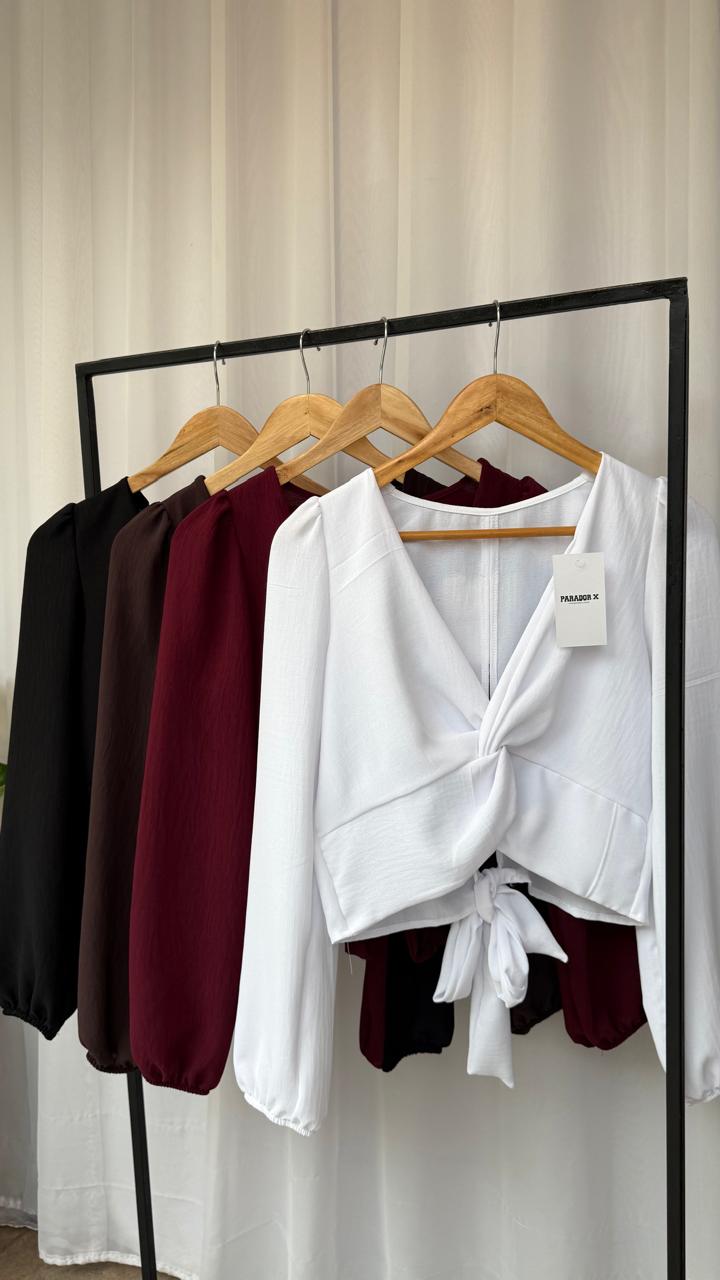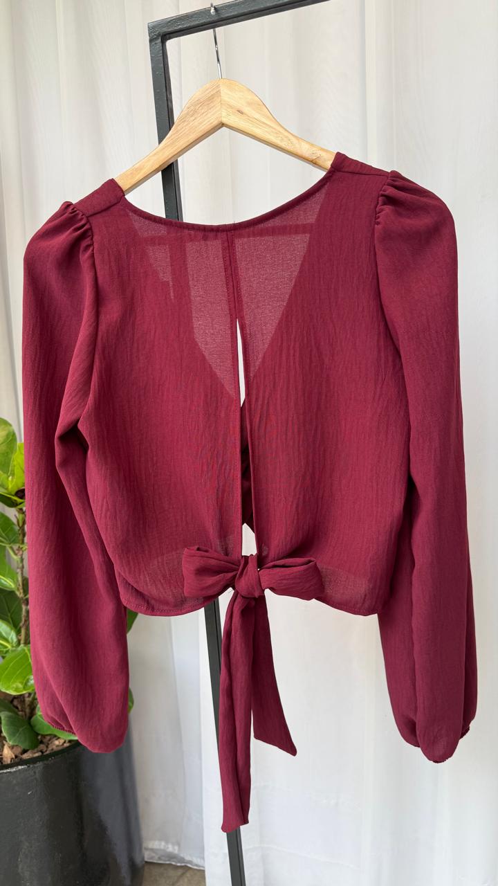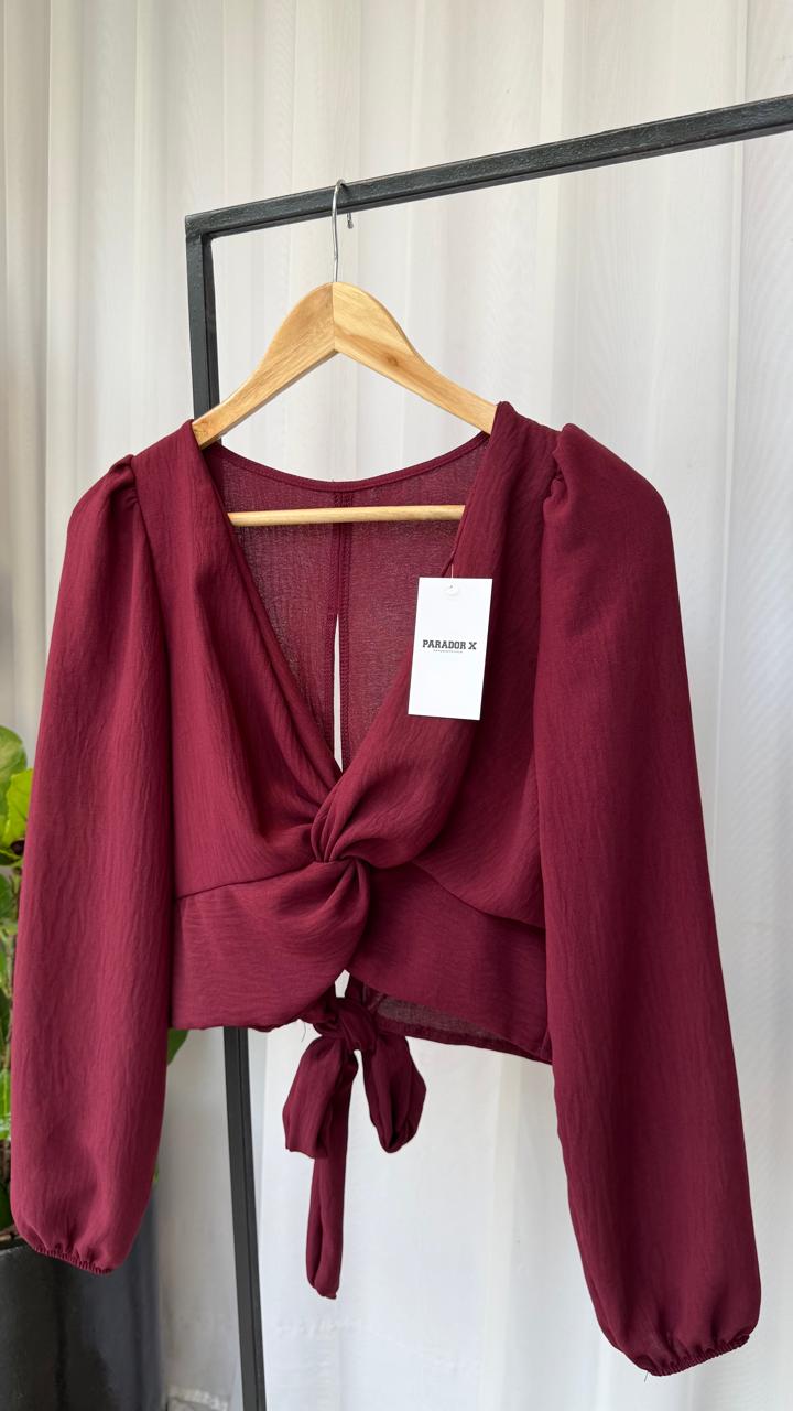 Blusa manga larga arriba de cintura, drapeado en medio del busto, apretar al atar atrás en cintura. tela razo creppe