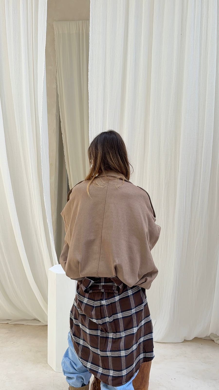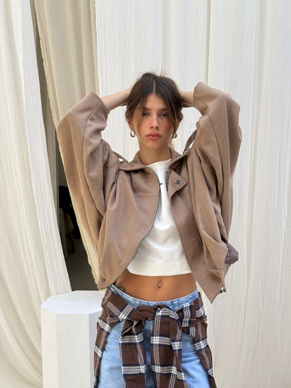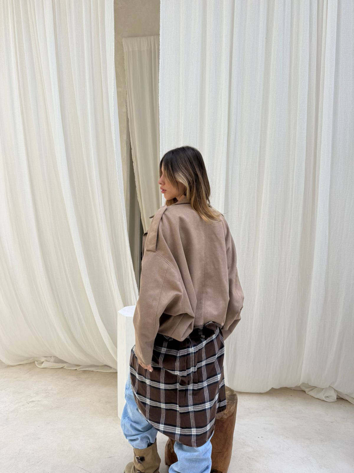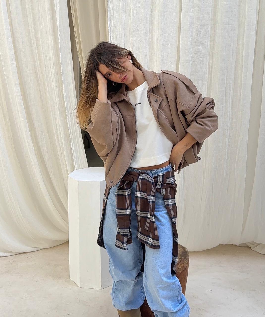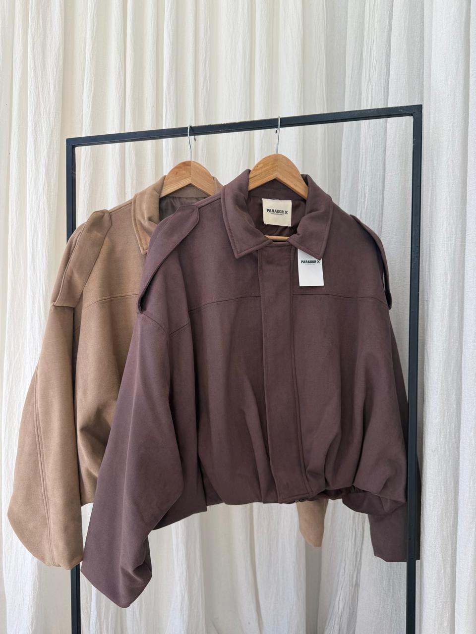 Campera super amplia hombros bajos, oversize, en cintura 6 pliegues para que se vea mas ancha, tela gamuza forrada con tafeta