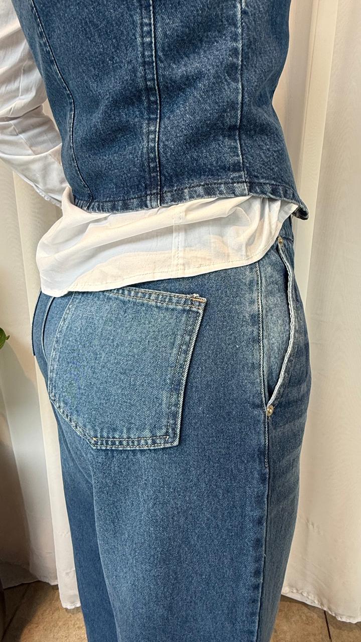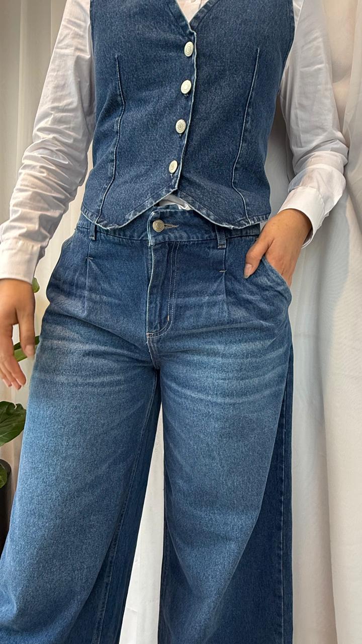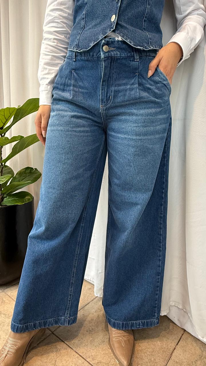 Pantalón wide leg (pierna ancha) tipo sastrero con pinzas bolsillo diagonal, tela denim (jeans) rígido