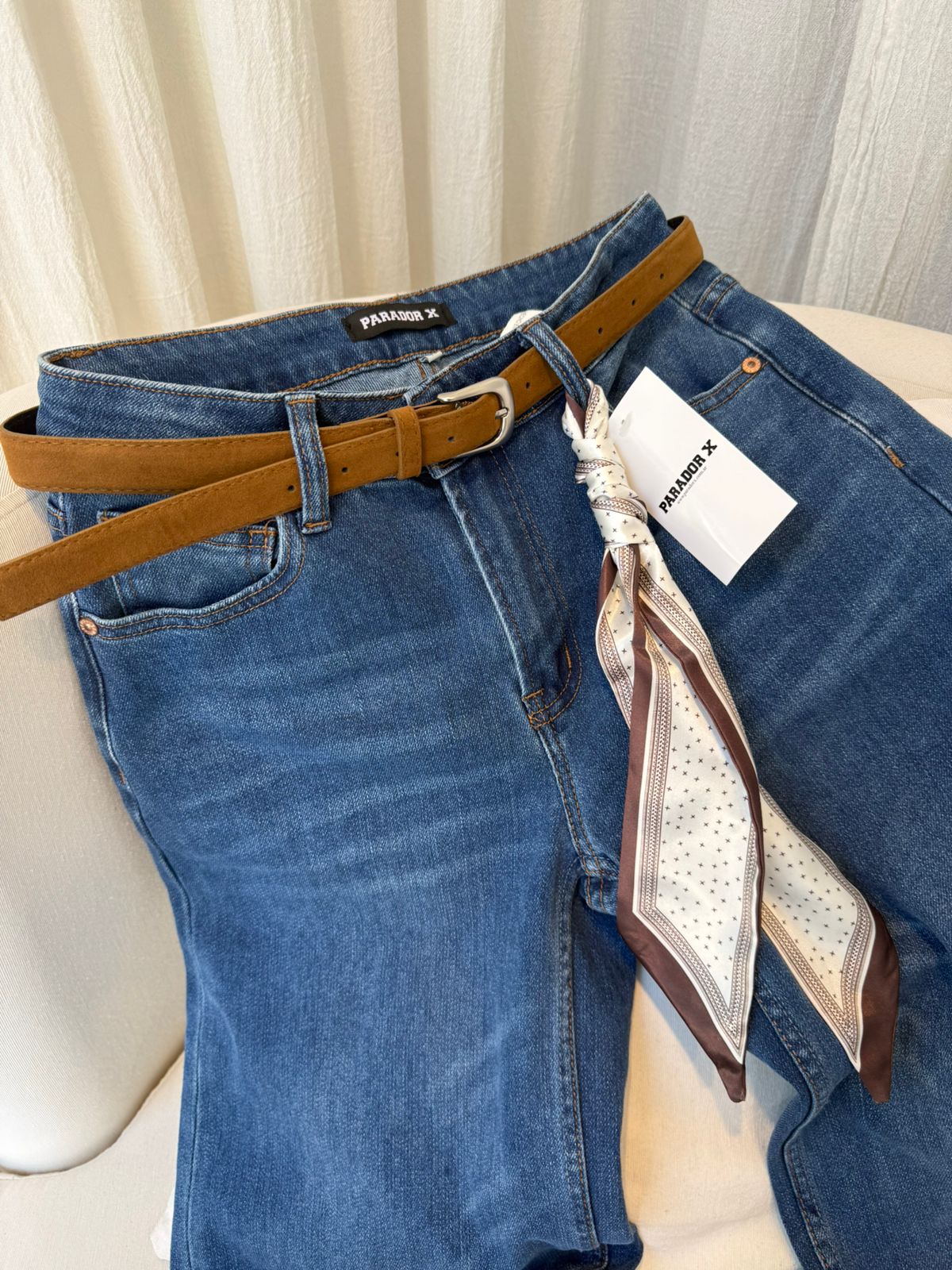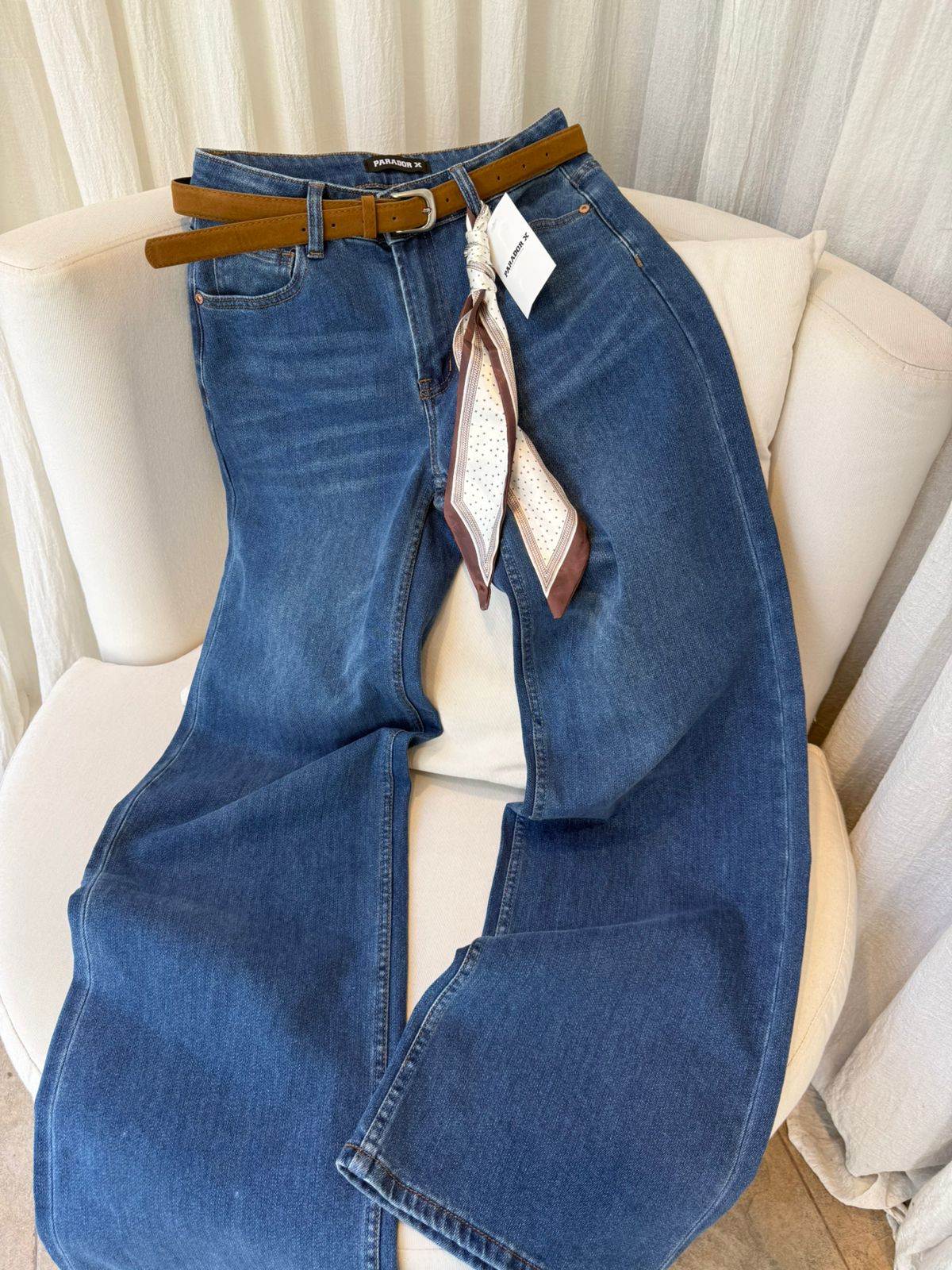 jeans pierna ancha, tiro alto, tiene de regalo cinto y pañuelo( pañuelo de cualquier color) tela jeans semi elastizada