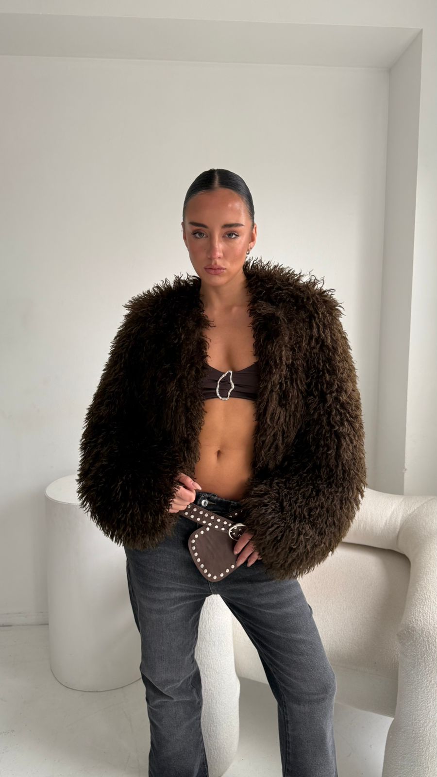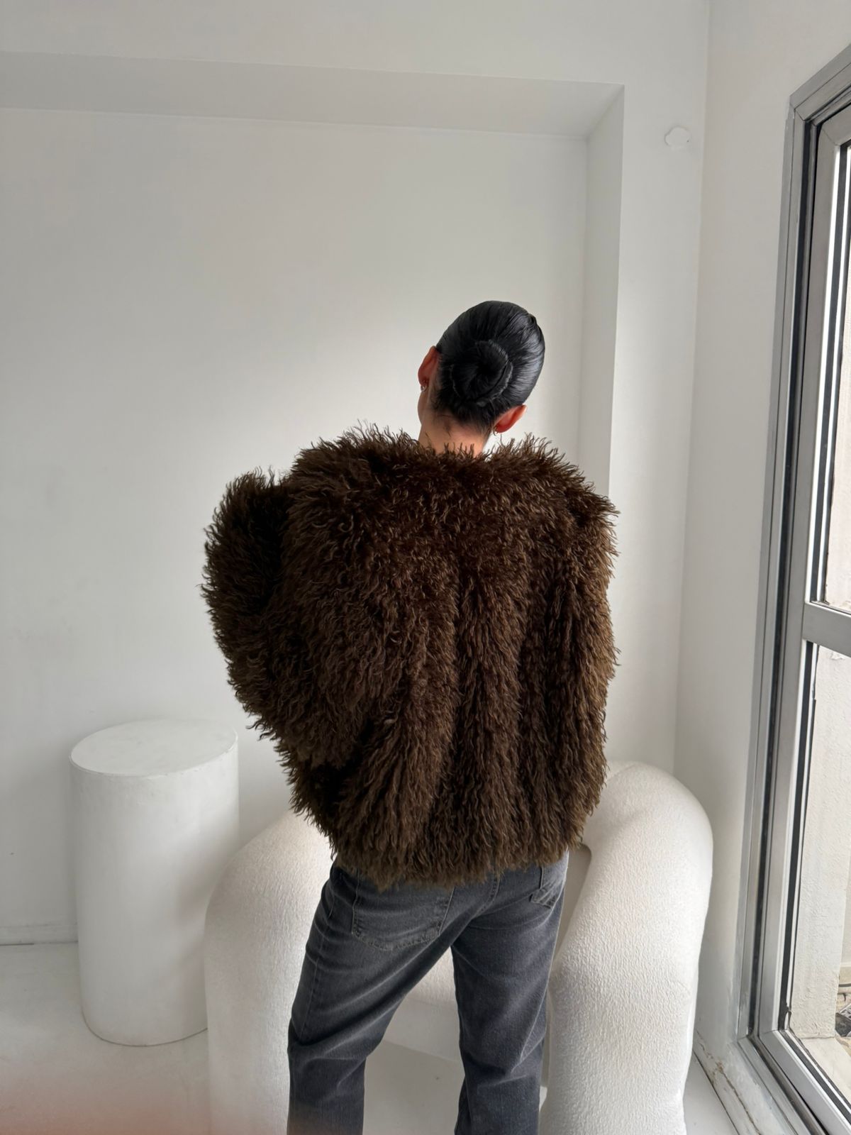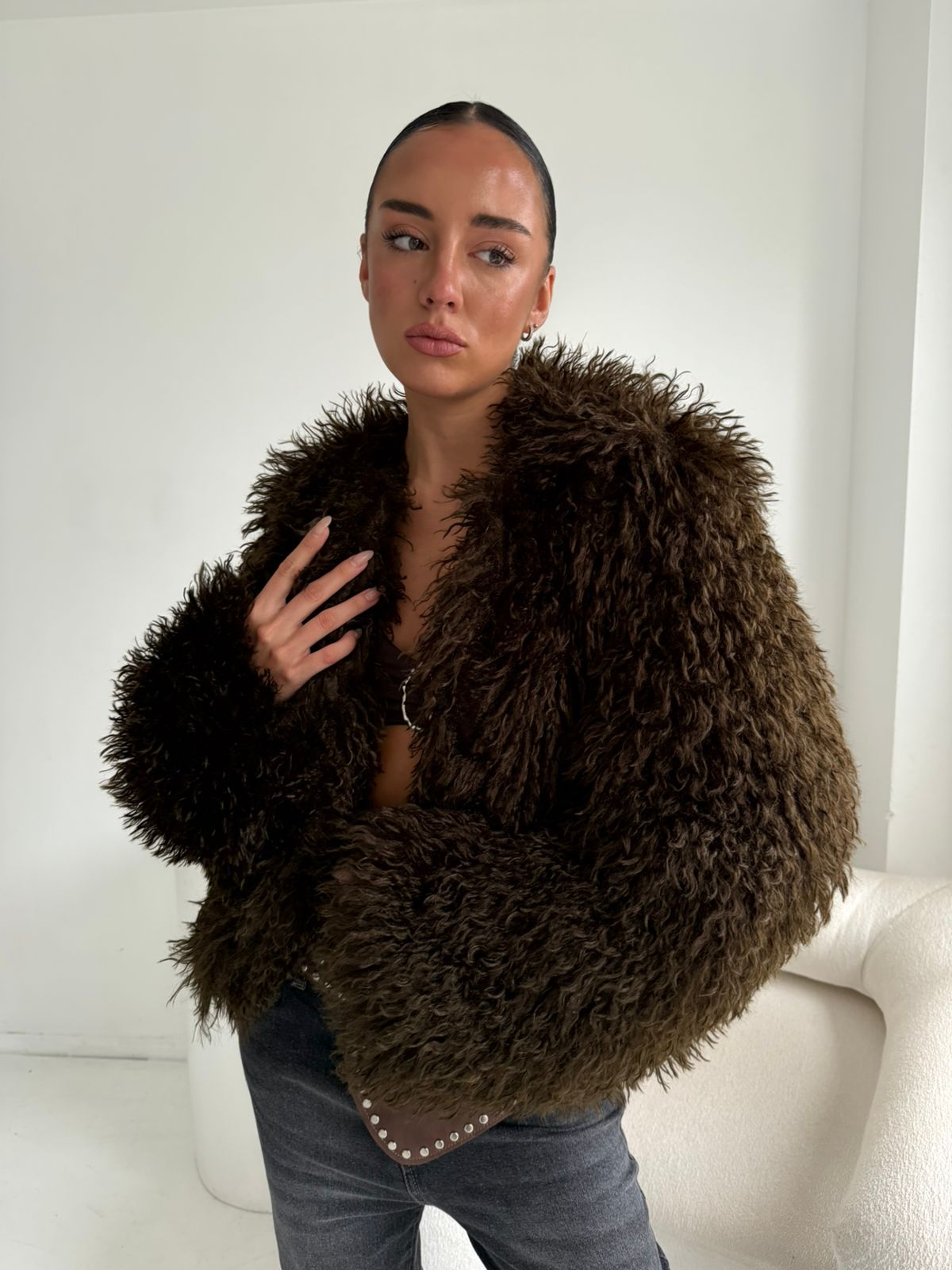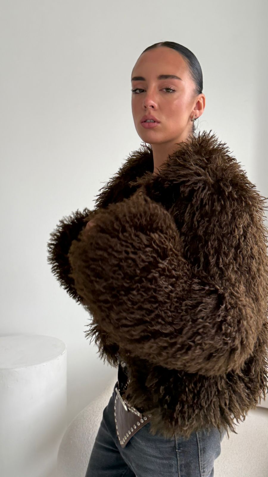 saco forrado color chocolate, pelo largo enrulado sintético, sin cierre sin broches