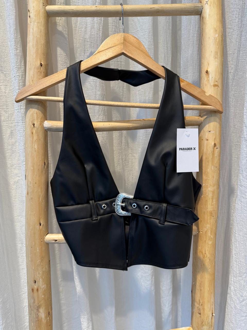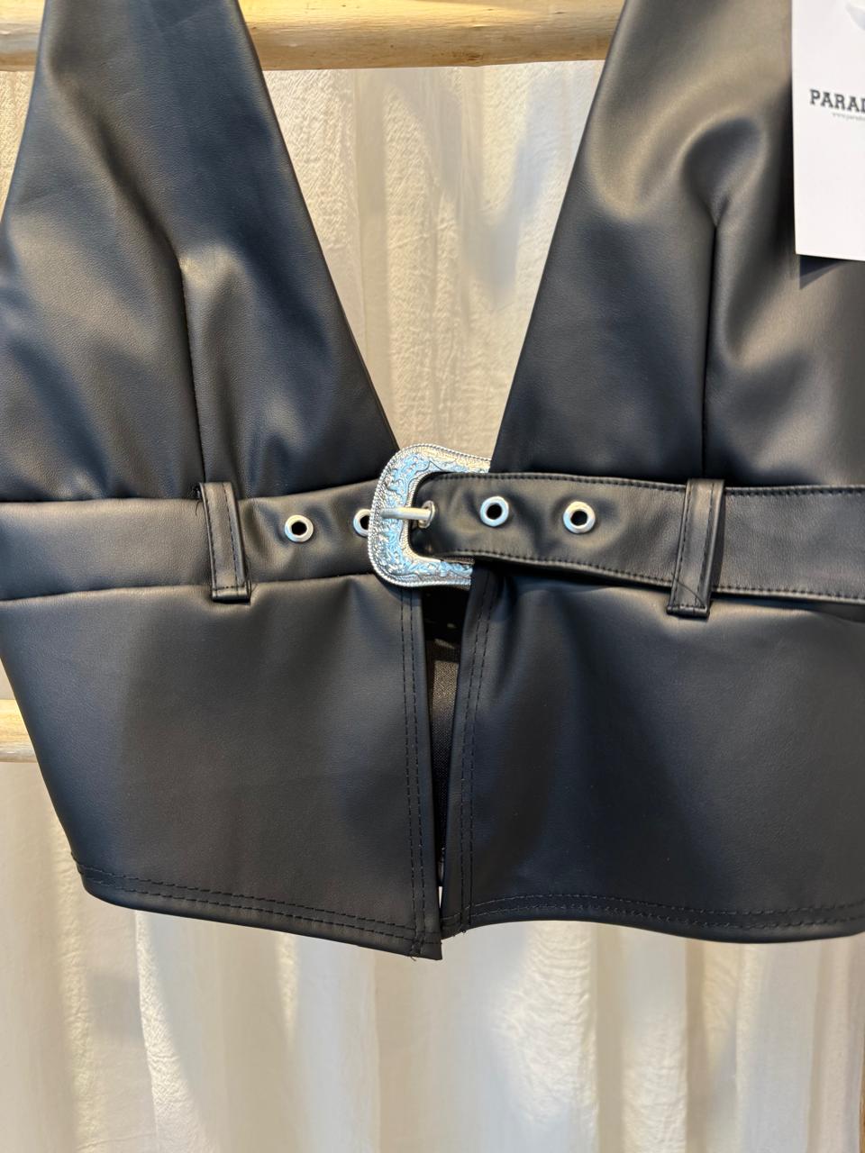 top eco cuero para abrochar en medio del pecho, tela Pu